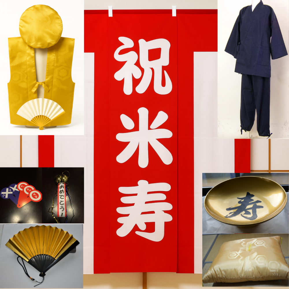 【彩りセット】米寿のお祝いレンタルグッズが一つになったお得なセット ちゃんちゃんこ、紅白幕、座布団、作務衣、金の扇子など。これ一つで米寿祝いの準備が整うセットです。