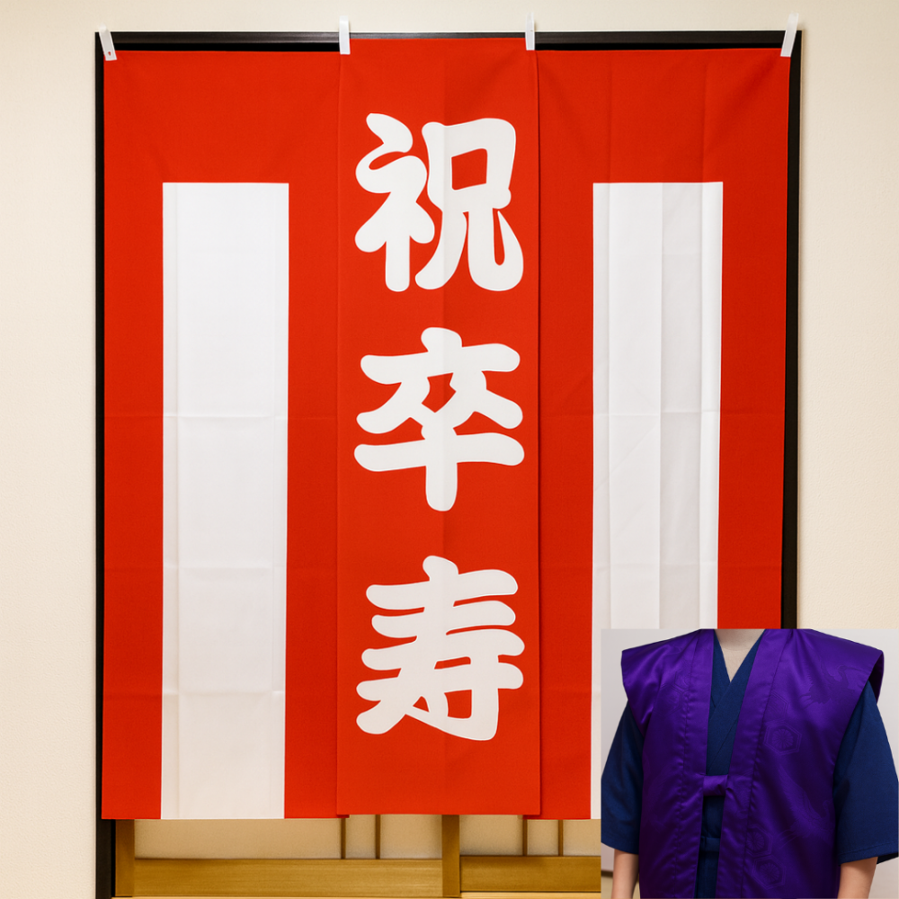 【Dセット】レンタルちゃんちゃんこ(紫・卒寿祝い・鶴亀柄)と紅白幕&作務衣セット