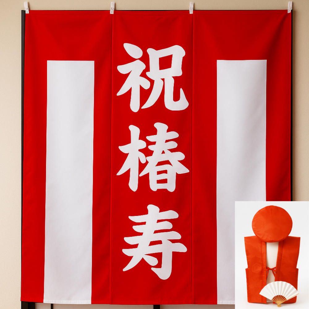 お祝い着(ちゃんちゃんこ)、大黒頭巾、扇子の3点と、お祝いの会を盛り上げるための紅白幕「祝椿寿」をご用意しました。