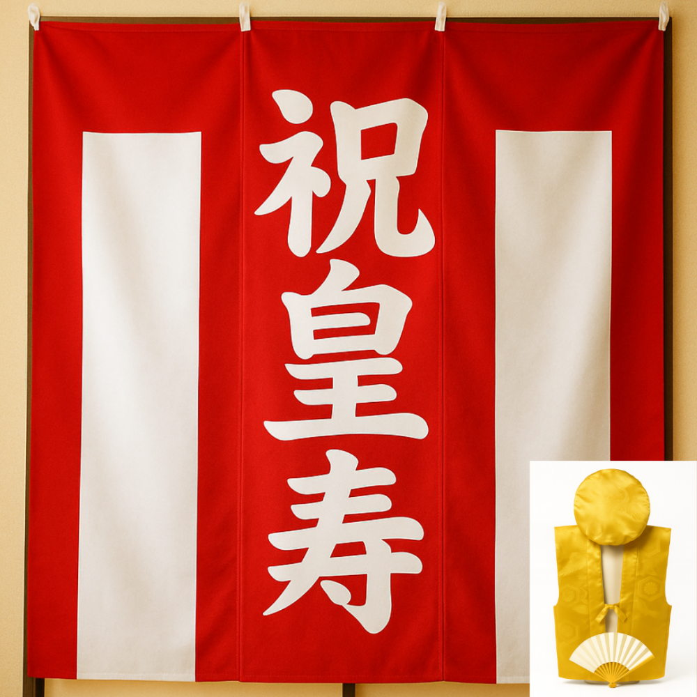 お祝い着(ちゃんちゃんこ)、大黒頭巾、扇子の3点と、お祝いの会を盛り上げるための紅白幕(祝皇寿をご用意しました。