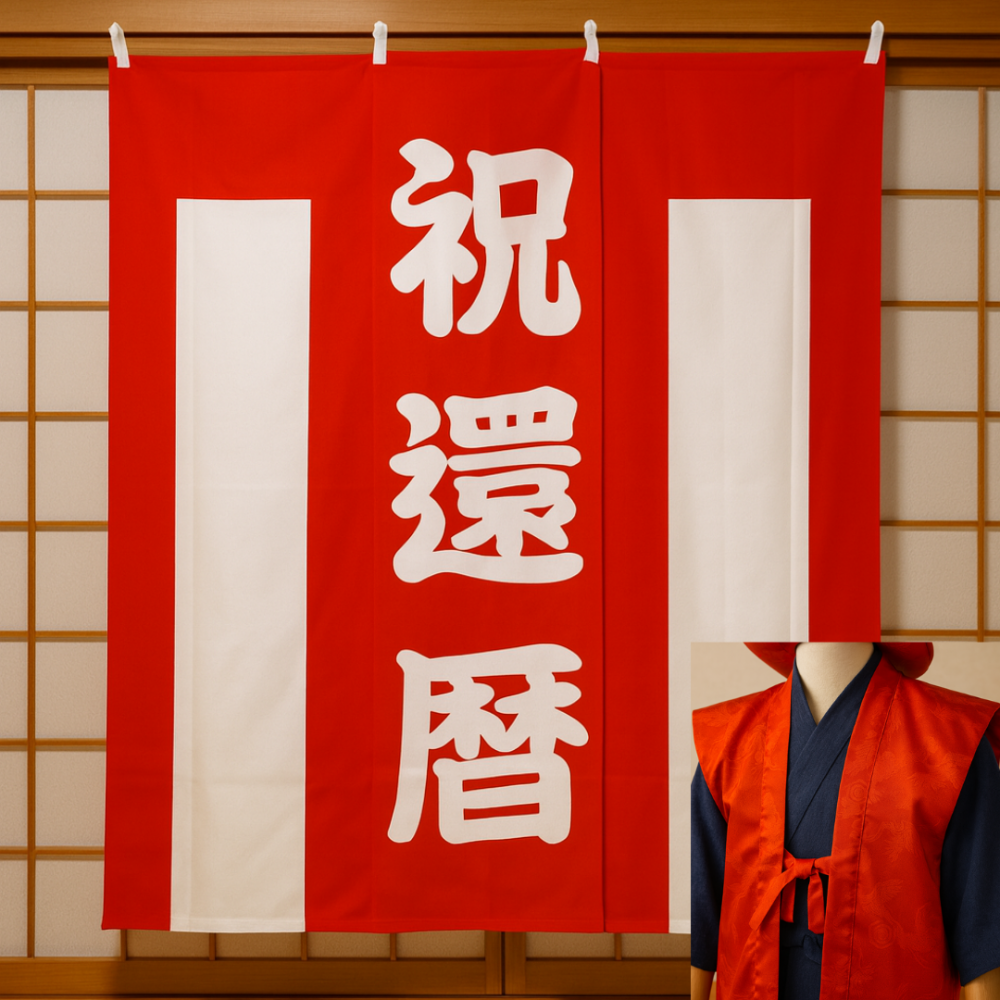 2.  > 【Dセット】レンタルちゃんちゃんこ(赤・還暦祝い・鶴亀柄)と紅白幕&作務衣セット